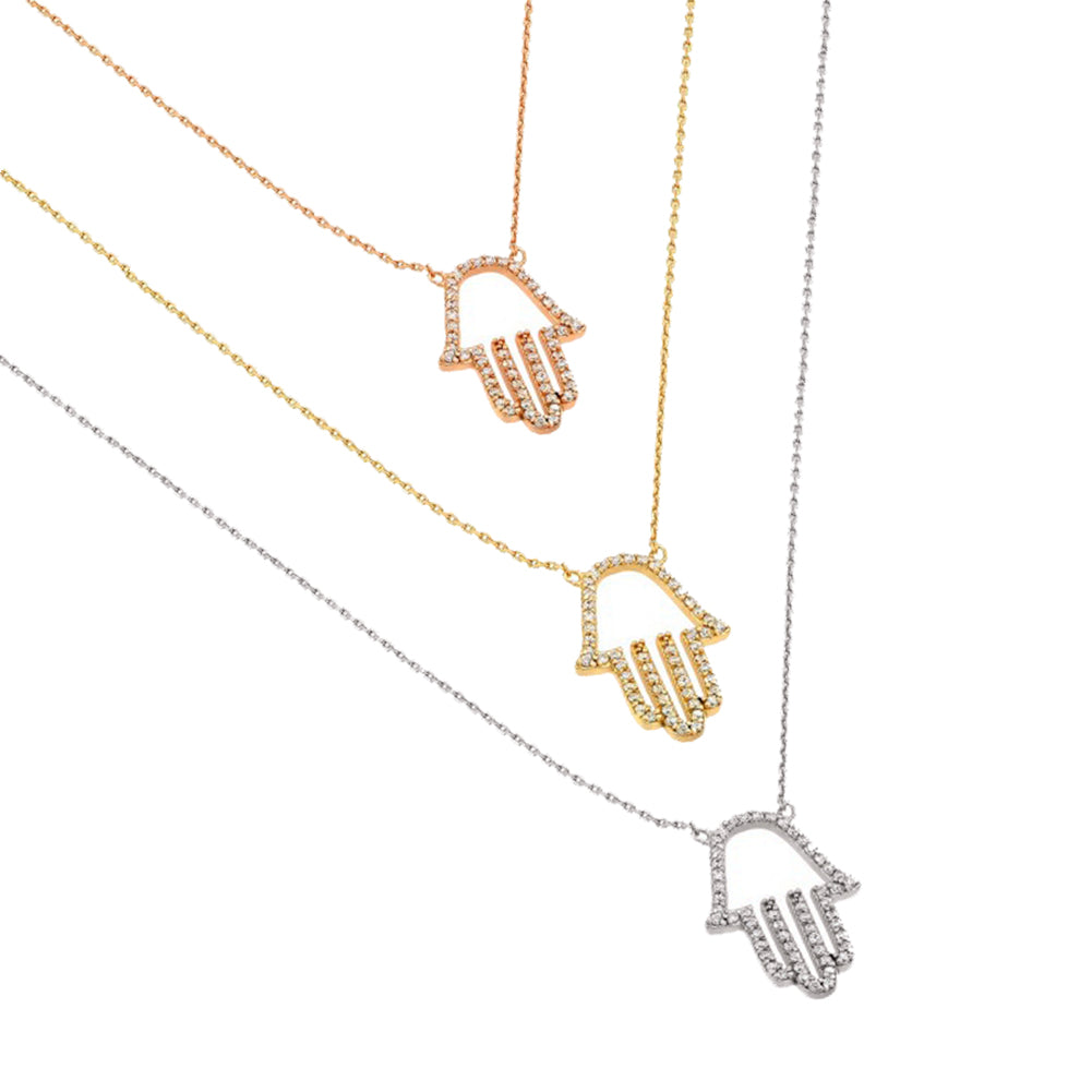 .925 Sterling Silver Gold Clear CZ Hamsa Pendant Necklace