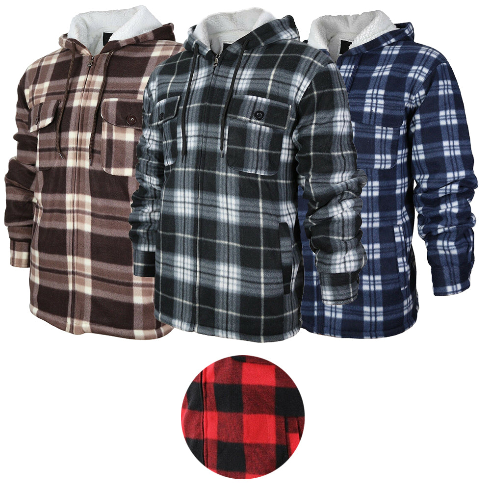 HanTon Men's 2 Pocket Sherpa Lined Heavyweight Hooded Fleece Plaid Jacket