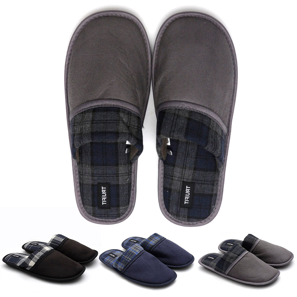 Mens Plaid Slippers Slip On Fleece Lined Indoor Comfortable Micro Suede Shoes